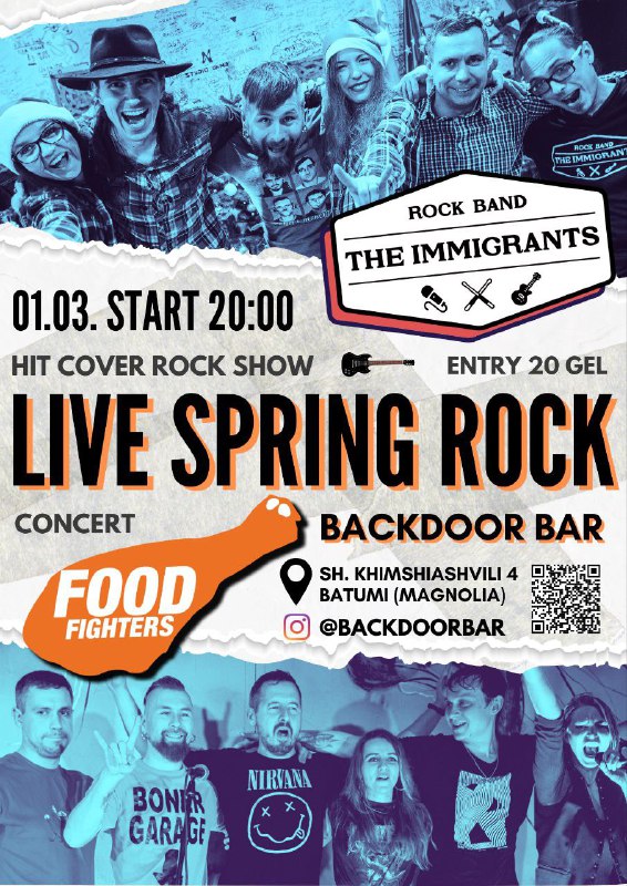 Весна – время любви, рок-н-ролла и нового совместного концерта лучших cover-rock групп The Immigrants и Food Fighters! Отожги с друзьями под крутые рок-хиты Green Day, Rammstein, КиШ, Nirvana, RATM, Foo Fighters в живом исполнении! Прыгай, танцуй, кричи и празднуй начало весны с нами!